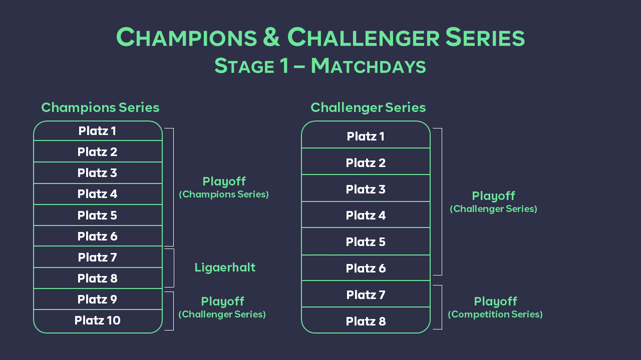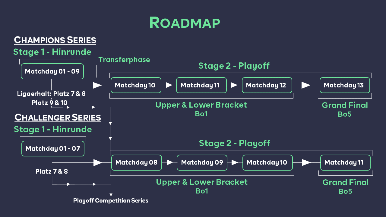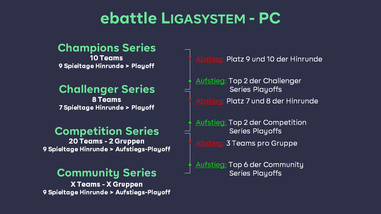 Die ebattle Liga besteht aus der Champions Series, Challenger Series, Competition Series & Community Series. Dabei ist die "Champions Series" die höchste Spielklasse in unserem Ligasystem. Hier haben sich die Top Spieler aus Deutschland-Österreich-Schweiz versammelt und kämpfen um den Titel des besten Teams auf ihrer Plattform. Die Teams der "Challenger Series" sitzen bereits in den Startlöchern auf dem Weg nach oben und werden nach jeder Saison die begehrten Plätze der "Champions Series" einnehmen. Direkt darunter findet die neue Competition Series ihren Platz. Hier haben die Teams in einer festgelegten Anzahl an Gruppen die Möglichkeit, um den Aufstieg in die Challenger Series zu spielen. Einstieg zu den oberen Ligen findet ihr in der "Community Series", die für jeden offen ist. Hier haben die Teilnehmer, wie auch in der Competition Series, über 9 Spieltage die Chance, sich mit den Teams in einer Hinrunde zu messen, um am Ende der Saison die verdienten Plätze für das Community Series Playoff zu ermitteln. Die Champions und Challenger Series spielen in Stage 1 die Hinrunde über 7 bzw. 9 Spieltage. Platz 1 bis 6 der Champions und Platz 1 bis 6 der Challenger Series qualifizieren sich anschließend für das Playoff der jeweiligen Liga, während die beiden Absteiger-Plätze jeder Series in dem Playoff der jeweilig darunterliegenden Liga um ihren Platz in der ursprünglichen Liga kämpfen müssen. Das Playoff der Champions Series baut sich wie folgt auf: Die Champions Series wird live von unseren Castern auf twitch.tv/ebattlegg begleitet. Auch die Challenger, Competition & Community Series wird von unserem Caster-Team auf ihren Kanälen übertragen. Aktuelle News, Beiträge und Insights zur ebattle Champions Series findet ihr auf twitter.com/ebattlegg Auf unserem YouTube Kanal youtube.com/ebattlegg findet ihr wöchentliche Highlights. Falls auch ihr in einem der Videos zu sehen sein wollt, so könnt ihr uns eure Clips gerne via Social's mit einem Link zukommen lassen.